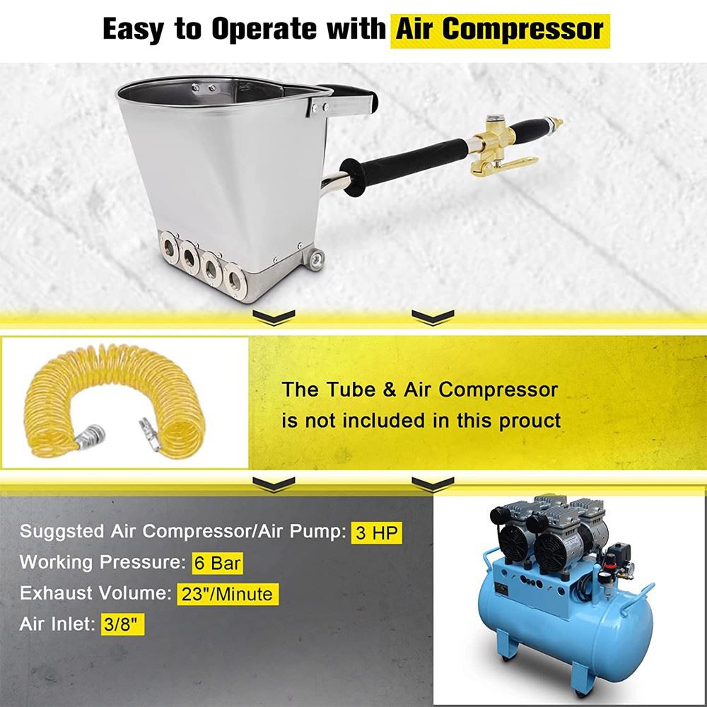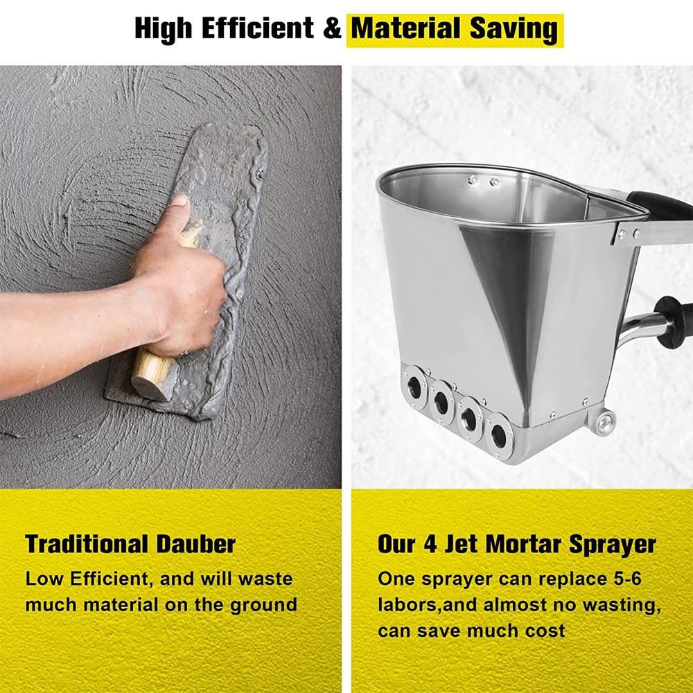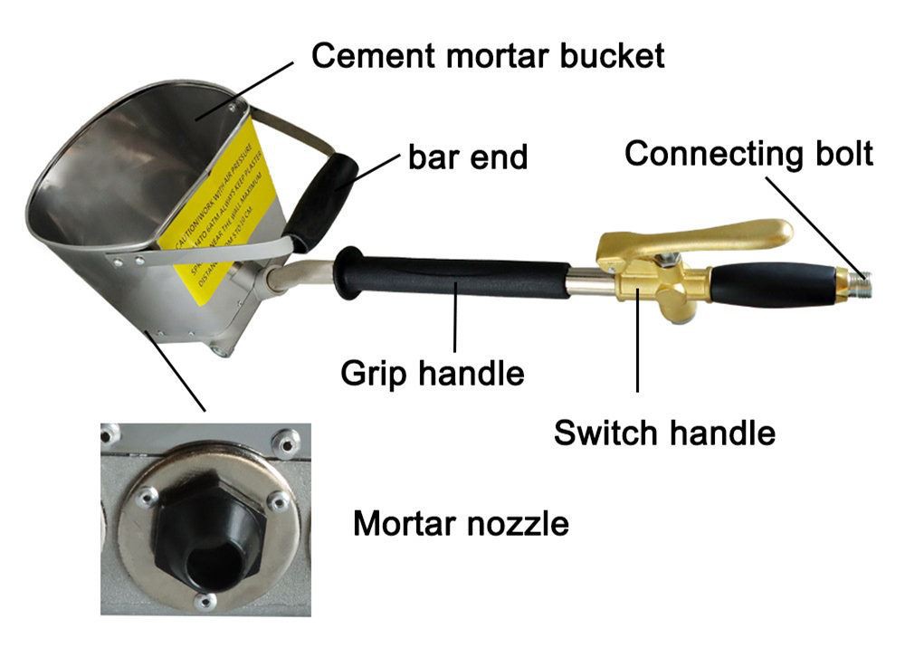 Piemērots lietošanai: apmetums, cements, ūdens dubļi, kaļķu virca, ūdensnecaurlaidīga java un citi plāni materiāli izsmidzināšanai